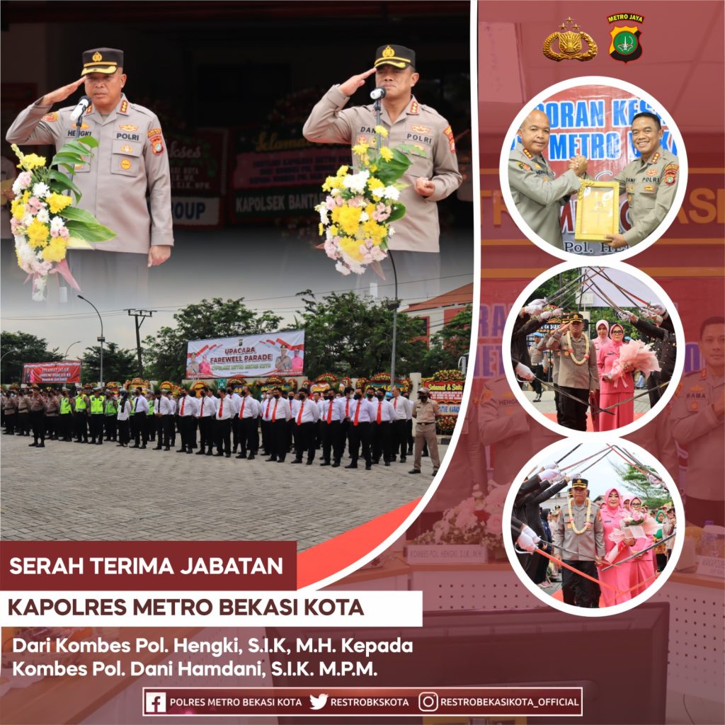 Pada hari Rabu tanggal 8 Maret 2023 telah dilaksanakan kegiatan Serah Terima Jabatan Kapolres Metro Bekasi Kota dari Kombes Pol Hengki, S.I.K., M.H. Ke Kombes Pol Dani Hamdani, S.I.K., M.P.M. bertempat di Polres Metro Bekasi Kota Jl. Pangeran Jayakarta no. 28 Kel. Harapan Mulya Kec. Medan Satria Kota Bekasi